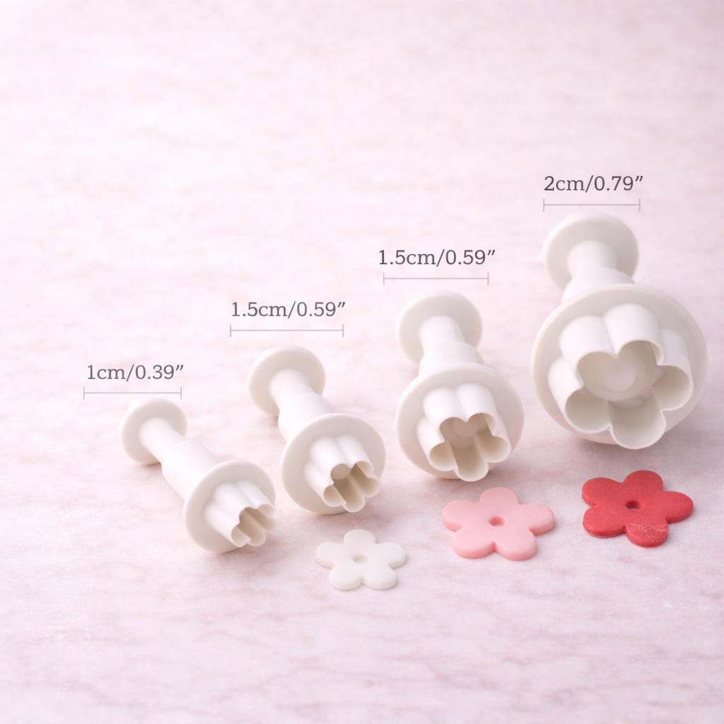 Blumen Ausstecher 4-teilig – Ausstecher-Set mit Auswerfer für kleine Blüten aus Fondant, Marzipan und Keksteig. Ideal für frühlingshafte Motivtorten, Cupcakes und kreative Backideen. Blumen-Ausstecher online kaufen für saubere und detailreiche Blütenformen!