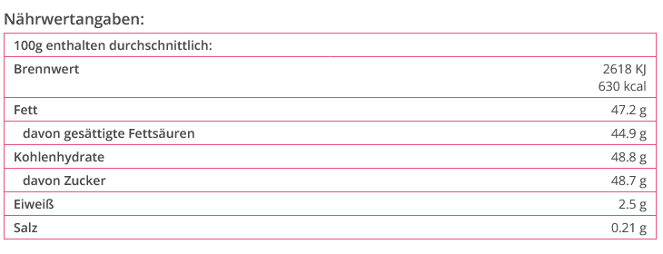 Zutaten: Zucker, pflanzliche Öle und Fett (Palmkernöl, Shea, Palm), MAGERMILCHPULVER, Emulgator: E322 Sonnenblumenlecithin; Salz, Vanillin, Farbstoff: E 129* (Allurarot AC). (*kann Aktivität und Aufmerksamkeit bei Kindern beeinträchtigen). Kann Spuren von SCHALENFRÜCHTEN enthalten.