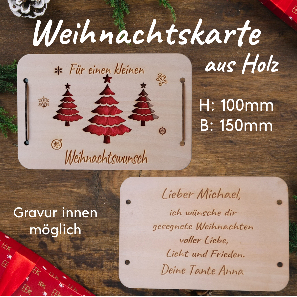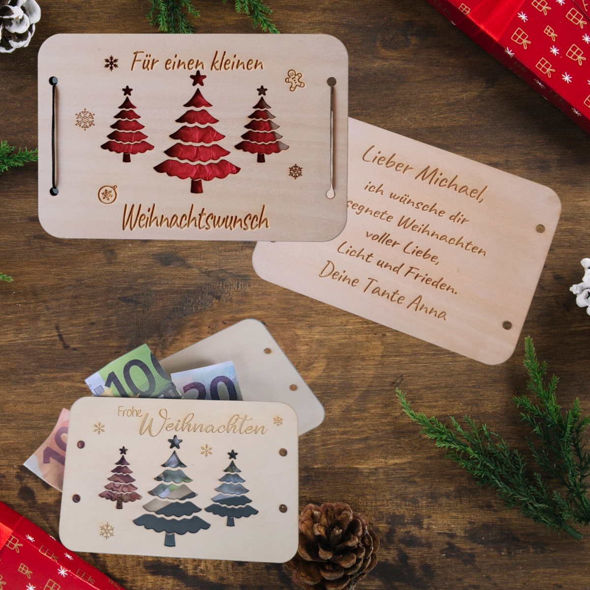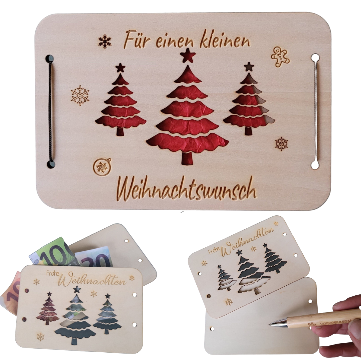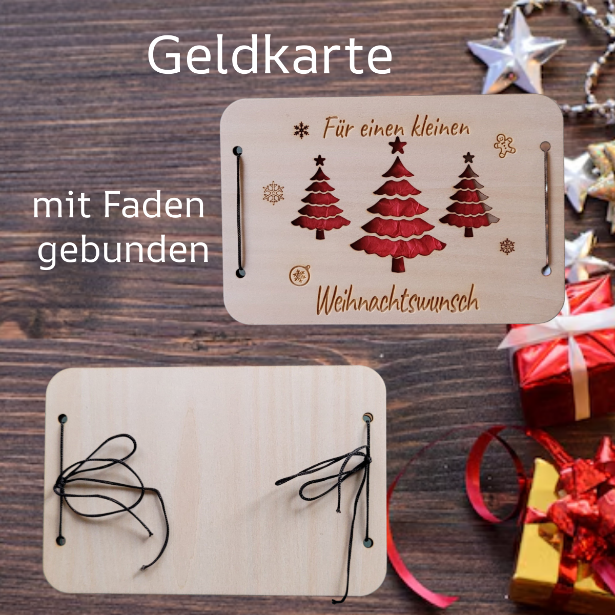 Weihnachtliche Geldgeschenkkarte aus Holz, auf Wunsch mit persönlicher Gravur innen. Schöner und persönlicher kann man Geld an Weihnachten nicht verschenken