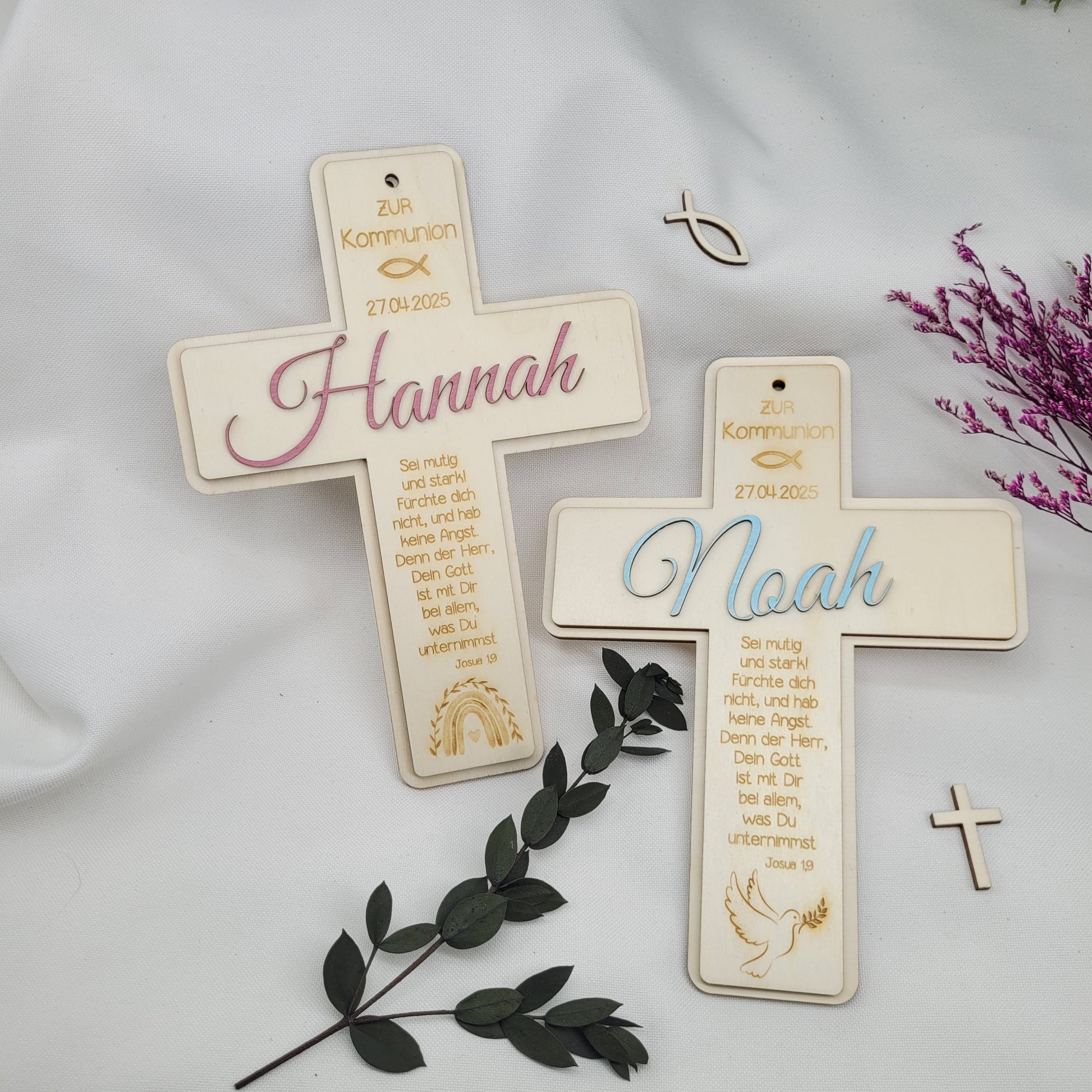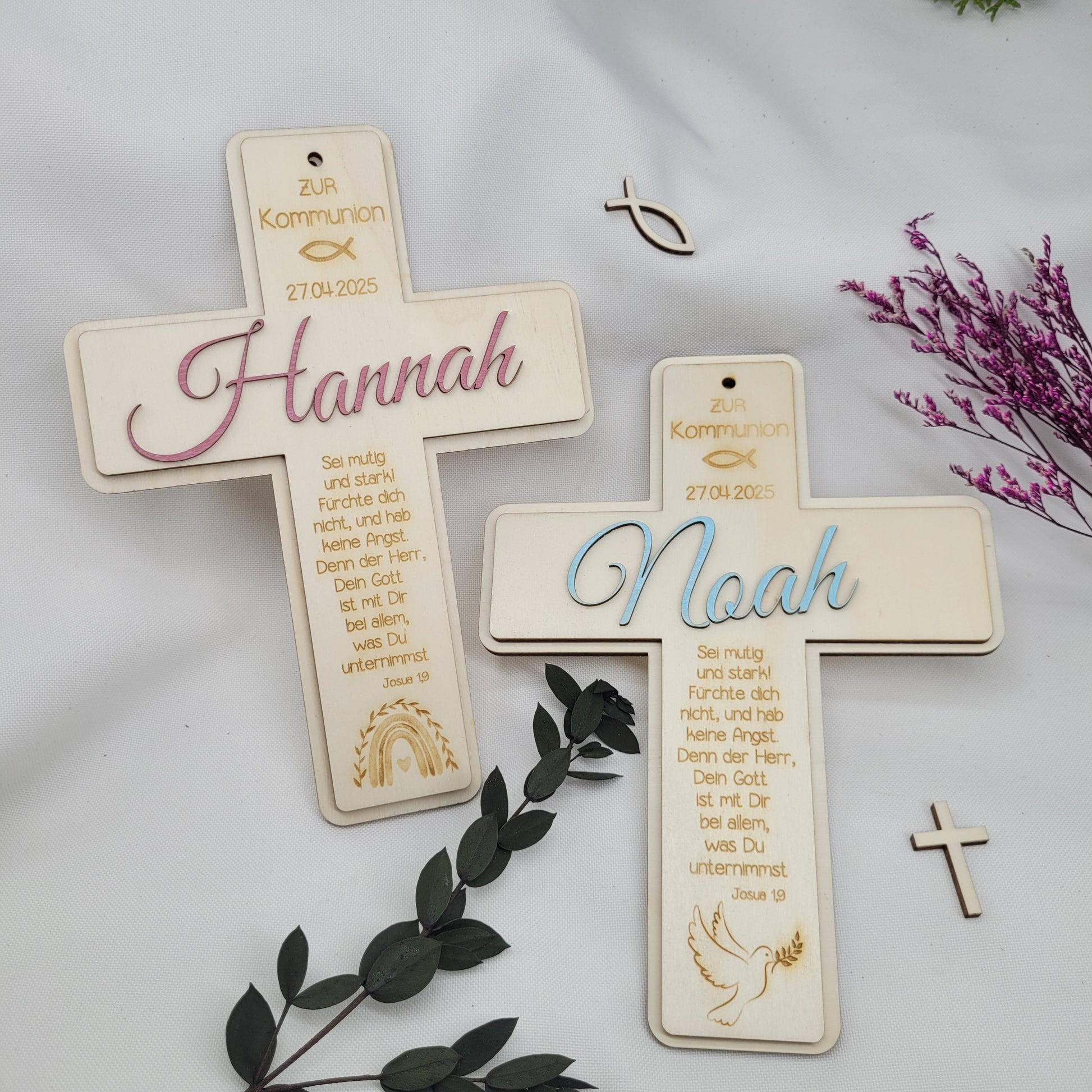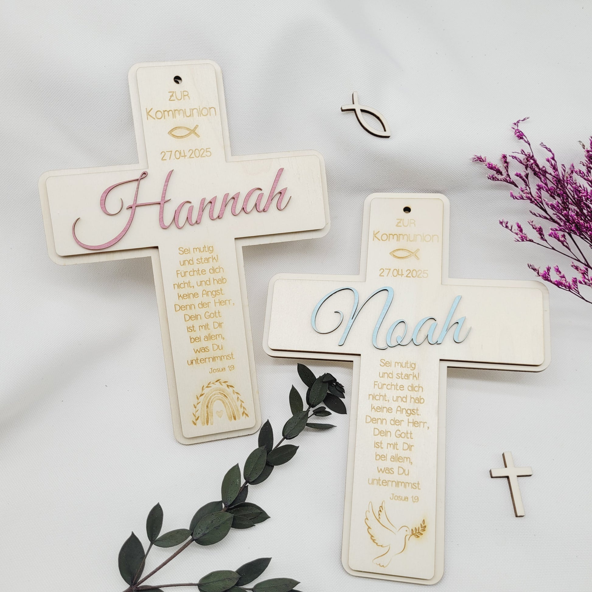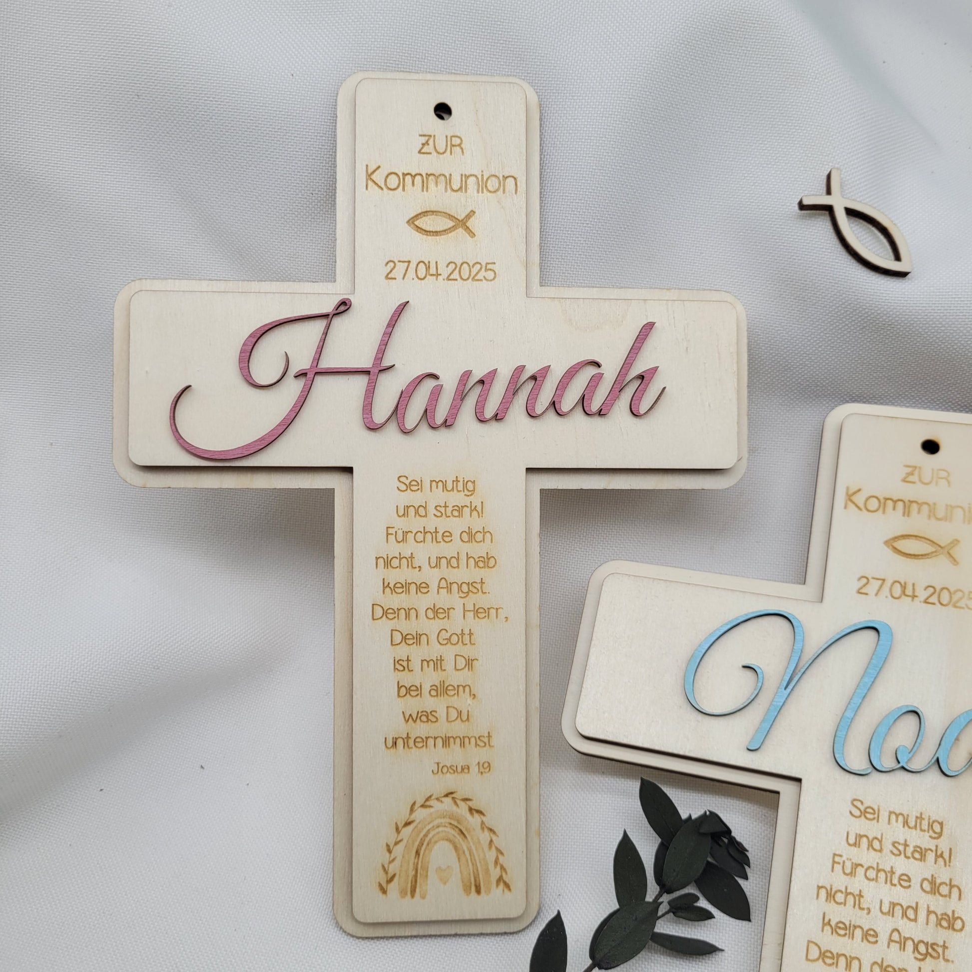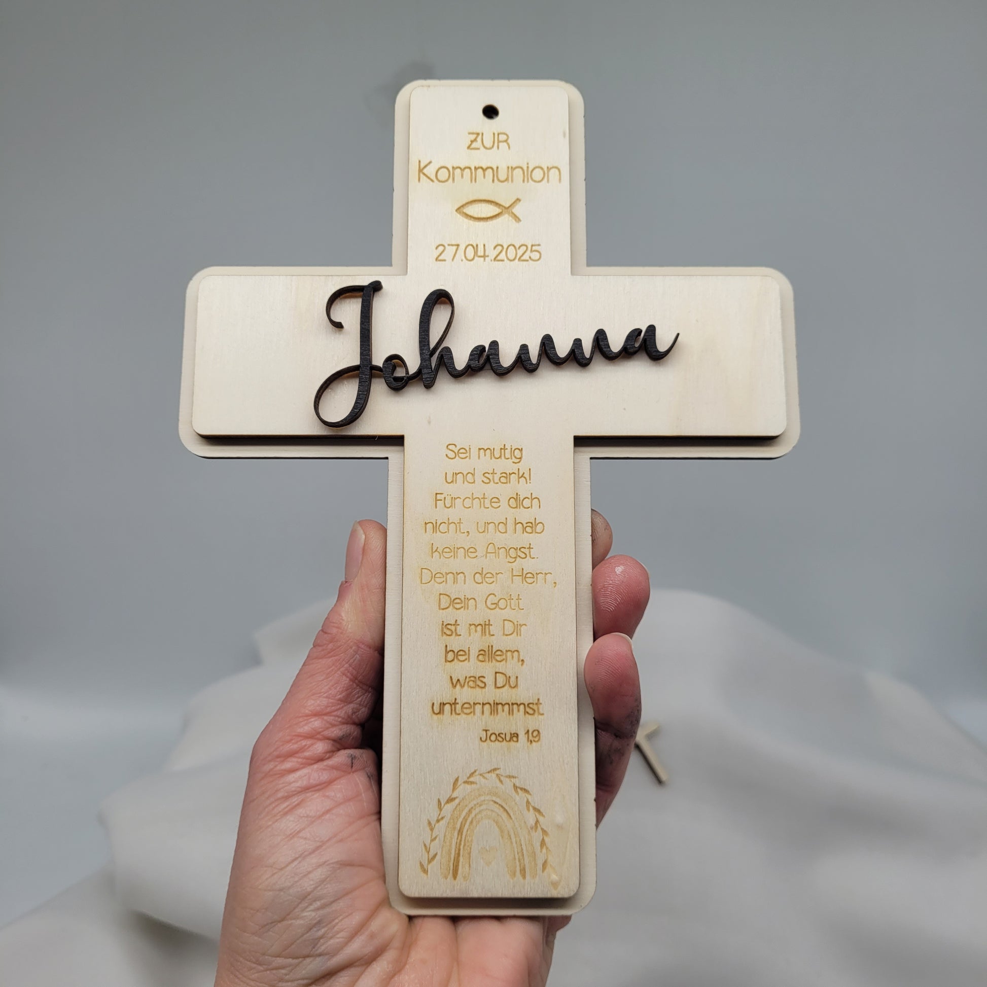 Das Kreuz wird in liebevoller Handarbeit aus Pappelsperrholz hergestellt und ist ein wunderschöner Hingucker. Das dekorative Kreuz wird mit dem Datum der Kommunion, einem Fisch, einem Regenbogen und einem Bibelspruch graviert.Der Name wird seperat aus Holz geschnitten und auf das Kreuz geklebt. Das Kreuz kann aufgehängt werden oder dekorativ am Tag der Kommunion als Tischdeko benutzt werden.