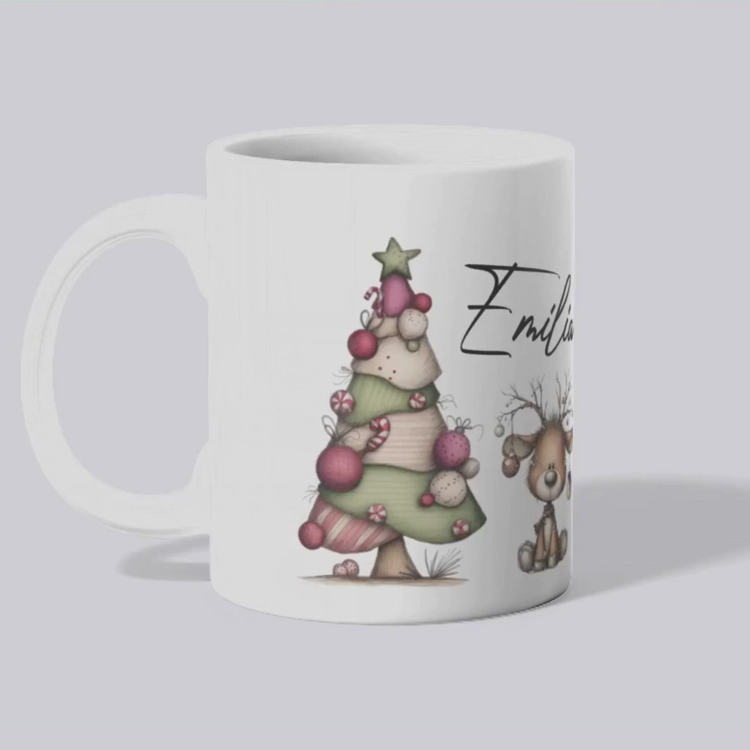 Süße Tasse mit Patchwork Tannenbaum und kleinem Rentier. Die Tasse kann personalisiert werden und ist ideal als Geschenk. Die Tasse kann mit einem passenden Untersetzer erweitert werden.