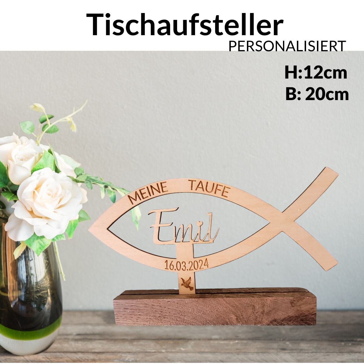 Feiern Sie den besonderen Tag der Taufe mit unserem wunderschönen, personalisierten Tischaufsteller aus Holz. Mit feinster Lasergravur wird der Name des Täuflings sowie das Taufdatum kunstvoll eingraviert – ein einzigartiges Symbol für diesen bedeutenden Moment. Das liebevoll gestaltete Design macht den Aufsteller zu einer stilvollen Dekoration auf dem Tauftisch und dient als bleibende Erinnerung an dieses besondere Ereignis.