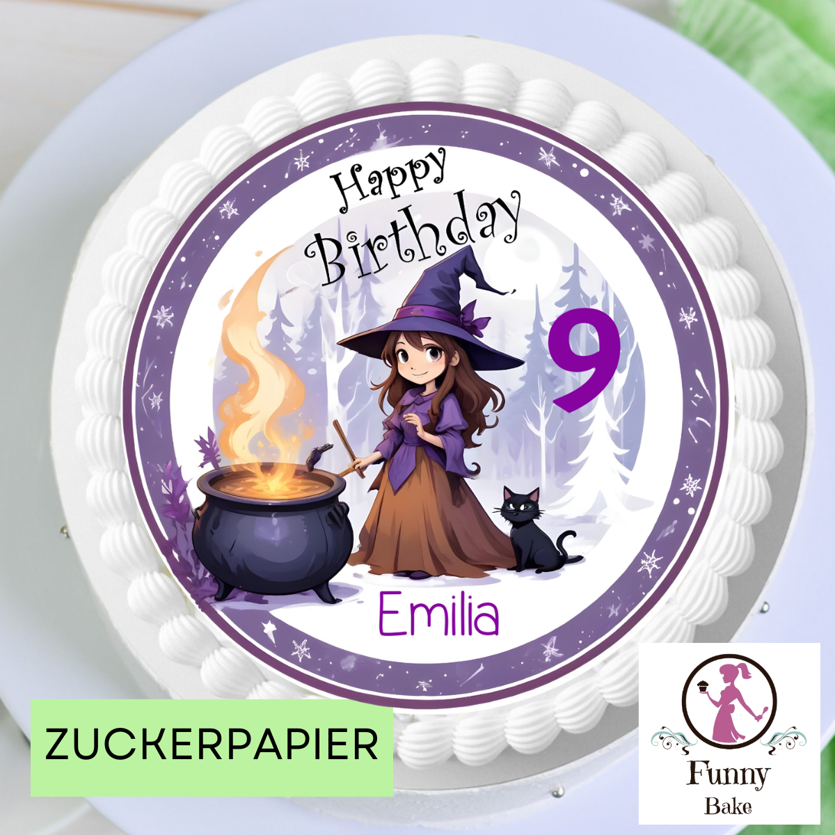 Zu einer richtigen Motto Party gehört ein schöner Tortenaufleger. und die kleine Hexe gehört sicher zu eine besonders schönen Feier. Farblich in Lila und Flieder gehalten lächelt eine kleine Hexe freundlich dem Geburtstagskind entgegen. Personalisiert mit Namen und Alter ist er das perfekte Highlight auf der Geburtstagsfeier.