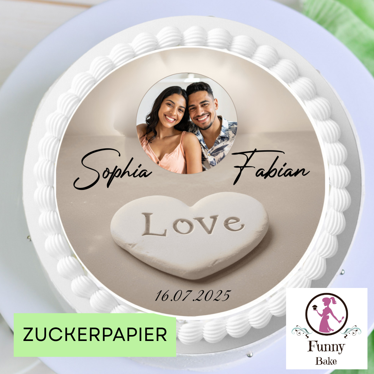 Personalisierter Tortenaufleger für Hochzeit, Liebe und Verlobung – passend für individuelle Hochzeitstorten und besondere Anlässe.