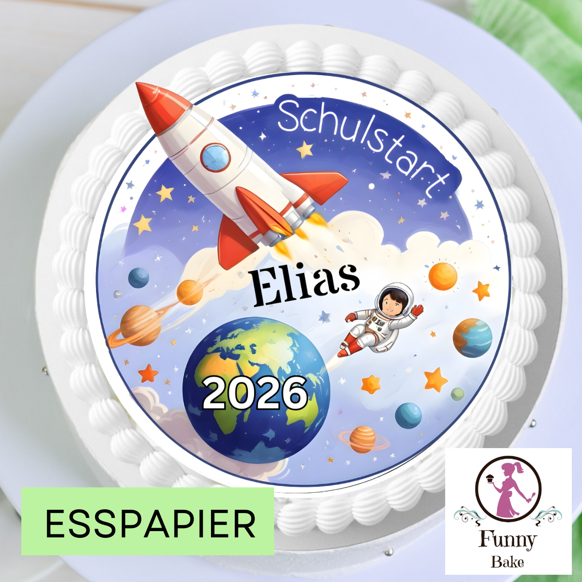 Durch die Personalisierung mit Name wird die Einschulungstorte individuell gestaltet, während die integrierte Jahreszahl auf dem Planeten den besonderen Anlass sichtbar hervorhebt. Der Aufleger eignet sich sowohl für klassische als auch für moderne Einschulungstorten und ist eine häufig gewählte Wahl für Schulanfang und 1. Schultag.