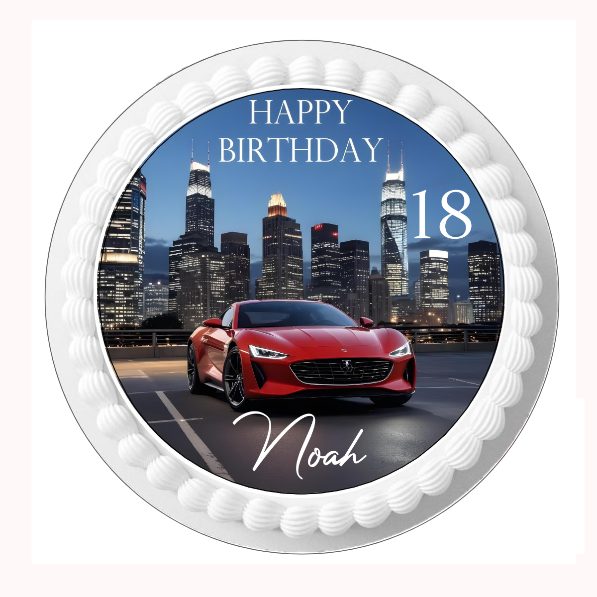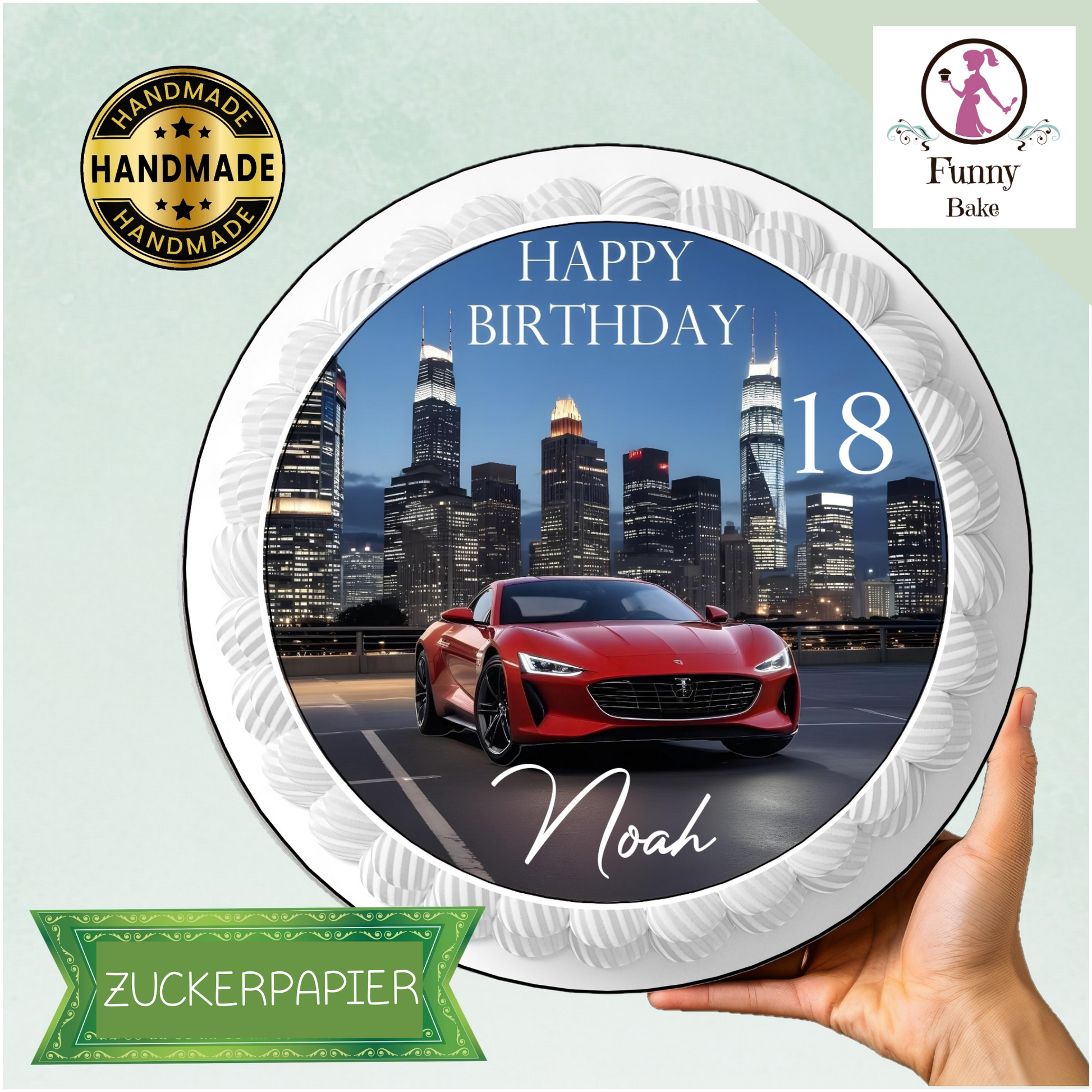 Exklusiver Tortenaufleger – stylisch, modern und absolut einzigartig! Mit diesem essbaren Aufleger wird jede Geburtstagstorte zum Hingucker. Das Motiv zeigt einen roten Sportwagen vor einer beeindruckenden Skyline – perfekt für Auto- und City-Fans.